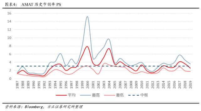 当公司处于内生、外延等高速发展阶段时,行业高景气度(BB值大于100%),公司PS估值将会有更高溢价。从应用材料1987-2019年的PS估值来看,2000年2004年的峰值分别达15.2X与9.6X,2007年后随着业务成熟,估值逐步趋于平稳,2017年后的估值中枢约2.7X,2017年峰值曾达5.8X。整体来看,1987-2019年公司PS估值中枢为3.04X。从泛林集团1987-2019年的PS估值来看,其PS估值历史中枢为2.28X,其中2000年与2004年的峰值分别达到9.8X与5.9X。2007年后,公司估值波动性亦有所下降。