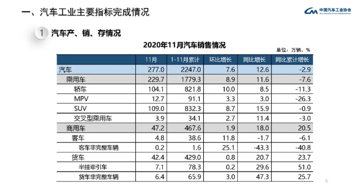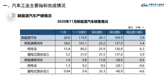 智通财经APP获悉,12月11日,据中国汽车工业协会统计,2020年11月中国汽车销量277万辆,同比增长12.6%。其中,新能源汽车销量20万辆,同比增长104.9%。