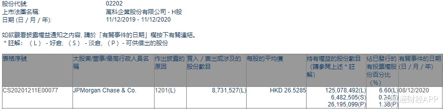 智通财经APP获悉,香港联交所最新资料显示,12月8日,摩根大通减持万科企业(02202)873.1527万股,每股作价26.5285港元,总金额约为2.32亿港元。减持后最新持股数目约为1.25亿股,最新持股比例为6.60%。