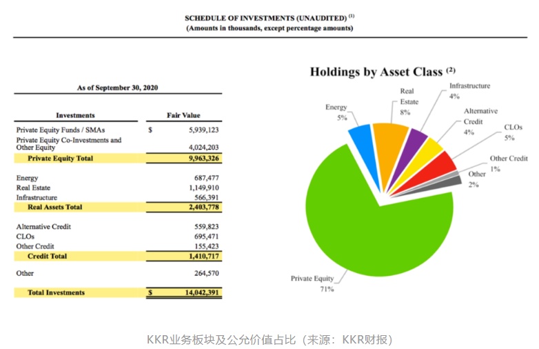 目前,KKR的业务已拓展到PE投资、能源、基础设施、房地产和信贷等多元领域。但是,PE始终为KKR的业务重心所在,其公允价值(Fair Value)在KKR总体业务的占比高达71%。