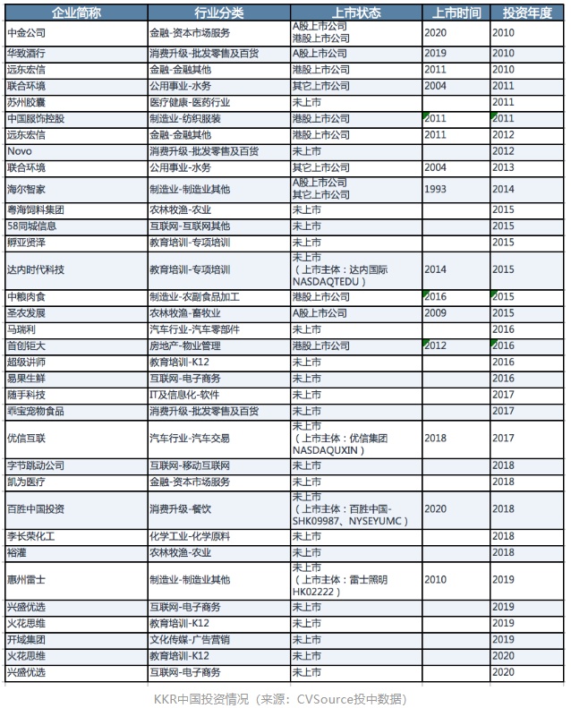 CVSource投中数据显示,2010年至2020年的10年内,KKR在中国的已投项目数量达34例,覆盖赛道包括消费、互联网、医疗、教育、农业等。