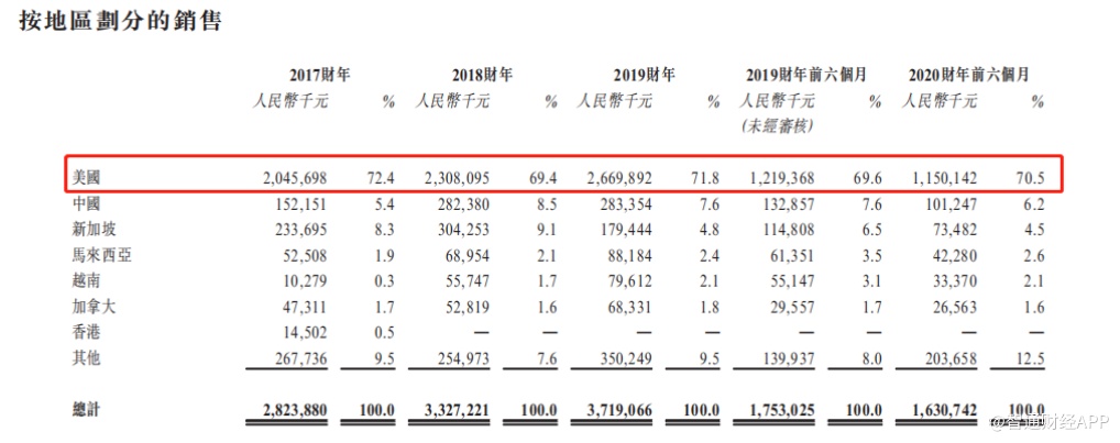 汇森家居的产品主要销往海外市场,包括海外零售连锁店直接销售或通过属于家具贸易商的客户销售,每年度出口至全球约50多个国家和地区。其中,美国为公司最大的销售市场,2020年上半年,公司于美国的销售收入达到11.5亿元,占比70.5%。