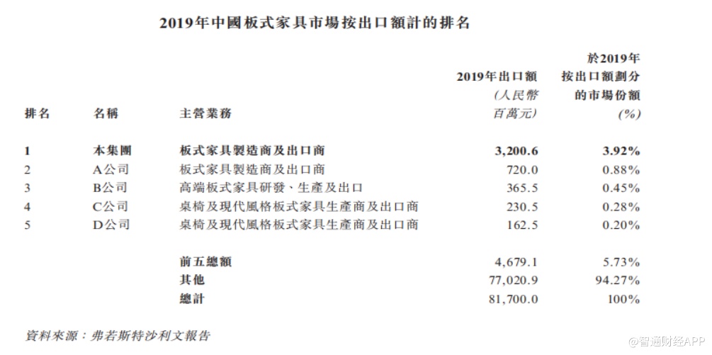 据弗若斯特沙利文报告,以出口额计,汇森家居为2019年中国最大的板式家具出口商,在中国的板式家具出口市场占有约3.92%的市场份额。2019年,中国前五大板式家具出口商的出口总额占中国板式家具出口总额约5.73%的市场份额,汇森家居的份额为第二名的近4.5倍。