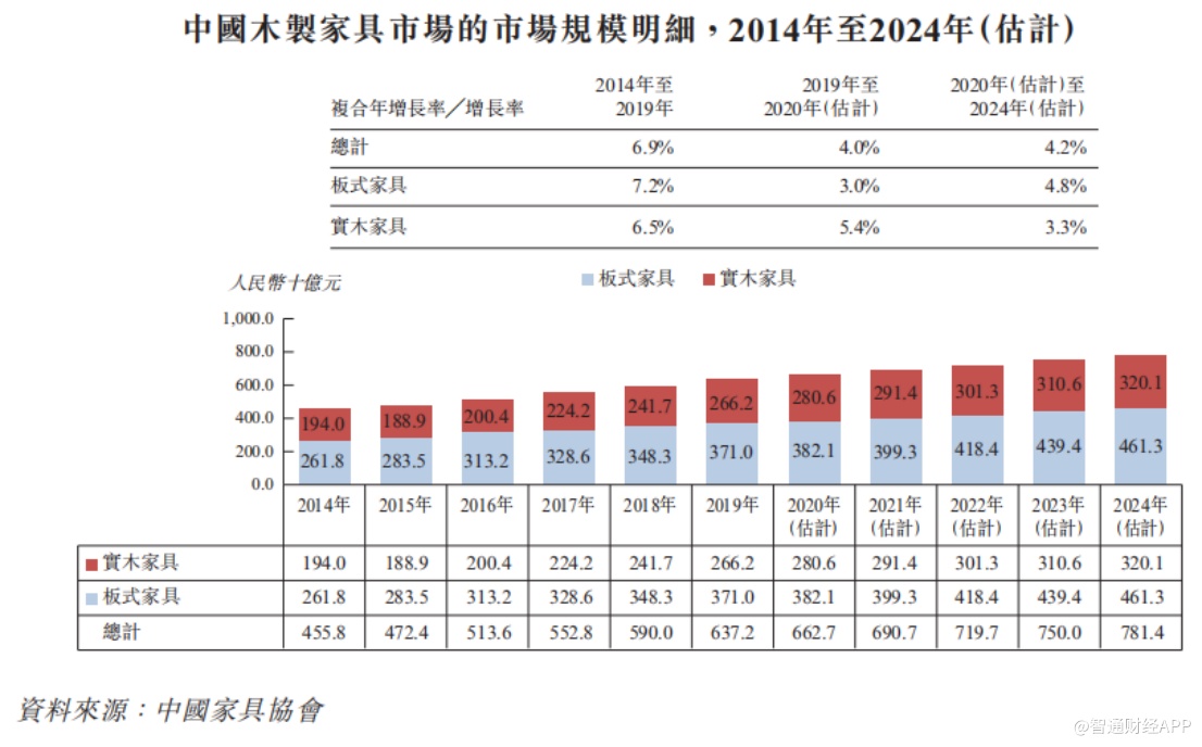据弗若斯特沙利文报告,中国板式家具和实木家具市场规模在2014年分别为2618亿元和1940亿元,随后板式家具市场规模以7.2%的复合年增长率增长至2019年的3710亿元,高于实木家具6.5%的复合年增长率。预计2020年至2024年板式家具市场规模将以4.8%的复合年增长率增长至3201亿元,增速仍将高于实木家具的3.3%。
