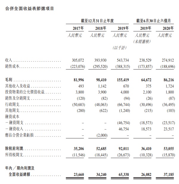 据招股书披露,该公司收入从2017年的人民币305.1百万元增加至2018年的人民币393.9百万元,并进一步增加至2019年的人民币543.7百万元,自2017年至2019年的复合年增长率为33.5%。