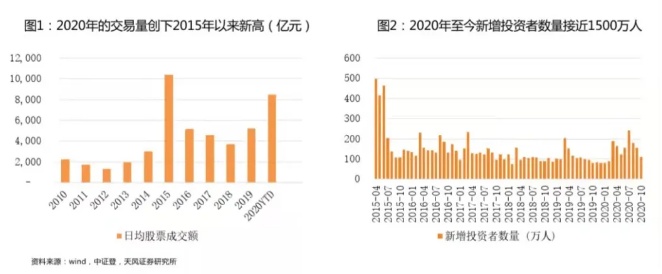 投资者数量:2020年至今月均新增投资者数量创下2016年以来的新高,期末投资者数达到1.75亿人。历史经验表明:若交易量增速放缓,新增投资者数量大概率将回落。