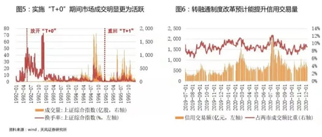 关键制度改变或将带来交易量的提升:1)假设单次“T+0”(当日回转交易)能够落地,预计将能够提升交易量,活跃市场,提高市场流动性。以上证综指为例,1992年5月21日,上交所实行“T+0”交易制度,同时取消对股票涨跌幅的限制,上证综指的股票日均成交量和换手率均有较为明显的提升。2)此外,若主板转融通制度得到完善,则融券规模有望提升,信用交易规模占比预计将提升。