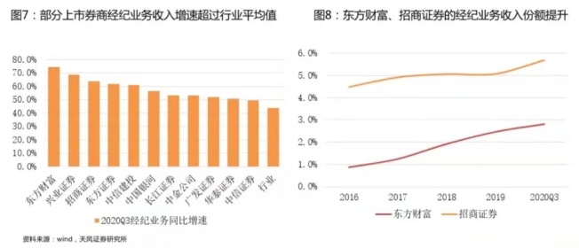 截至2020年Q3,东方财富、兴业证券、招商证券等证券公司经纪业务收入增速高于行业平均增速。