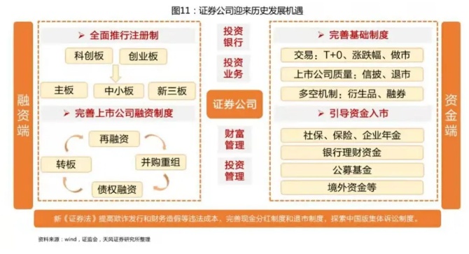 全面实行股票发行注册制,提高直接融资比重是未来五年资本市场发展的重点任务。监管着力于提高上市公司质量,并购重组和再融资等业务也将迎来发展期。实行“T+0”、融券和衍生品扩容预计将有助于机构投资者进入市场。