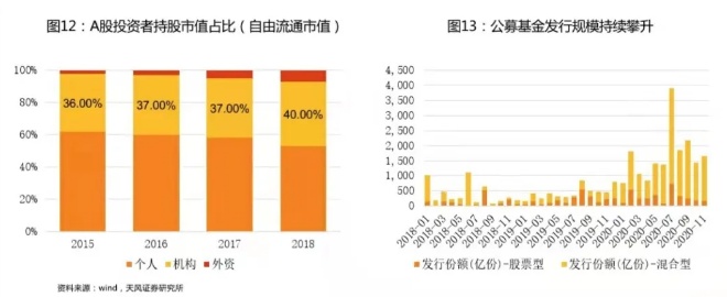 资本市场逐渐呈现出机构化的特点,将驱动机构业务繁荣。在养老金/职业年金入市、国有资本运营机构的培育、财富管理业务与资产管理业务的发展、私募基金的成长以及国际机构投资者的进入等一系列积极因素的驱动下,A股市场机构投资者持股市值余额持续攀升。未来个人投资者大概率将借道公募基金、私募基金等机构参与资本市场,将加速A股市场机构化。
