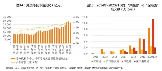 资本市场间互联互通加深的背景下,外资加速流入A股市场,持股市值及比例均呈现高速增长的态势。截至三季度末,外资持仓市值高达2.75万亿元,占A股流通市值的4.7%,总市值的3.8%。