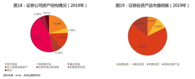 未来行业所面临的主要风险之一是信用风险,主要包括自营投资业务(债券发行人信用风险)、信用业务(股票质押的融资人信用风险)等。截至2019年底,证券投资业务金额为3.22万亿元,占总资产的比例为44%,是行业做大资产负债表的主要方向。其中,债券投资金额为2.18万亿元,占证券投资业务金额的比例为68%。
