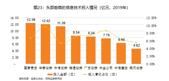 金融科技的发展存在较为明显的“马太效应”,国泰君安、华泰证券、中信证券等2019年的信息技术投入超过10亿元,而中小券商或因业务量原因导致投入产出效应不足,IT系统建设落后于头部券商。