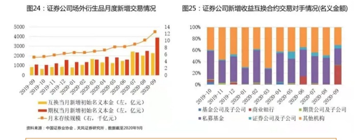 场外衍生品的两大买方机构的潜在需求依旧旺盛。1)商业银行方面,银行理财产品净值化管理后,结构性理财产品的占比提升,商业银行需要通过衍生品对冲交易来平滑净值波动;2)私募基金方面,再融资新规松绑后,私募基金借道证券公司通过场外衍生品+定增的模式进入资本市场。因此,我们判断场外期权和场外互换的规模不断提升,预计将为券商带来较为可观的业绩增量。