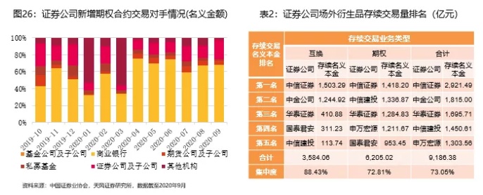 头部券商占据场外衍生品交易量的主要市场份额。存续名义本金规模较大的前五家证券公司在收益互换、场外期权中的全行业占比分别为 88.43%、72.81%,在整个场外衍生品业务中占到 73.05%。