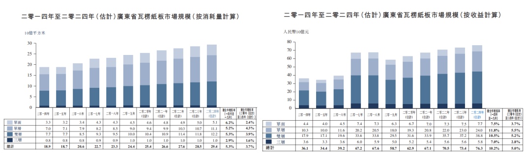 就消耗量而言,中国中国瓦楞纸板市场由2014年的791亿平方米增至2019年的814亿平方米,预计于2024年前将进一步增至949亿平方米,其中2020年至2024年复合年增长率为3.0%。在这其中,广东省瓦楞纸板市场最为突出,占中国瓦楞纸板市场约30%的总消耗量及收益。