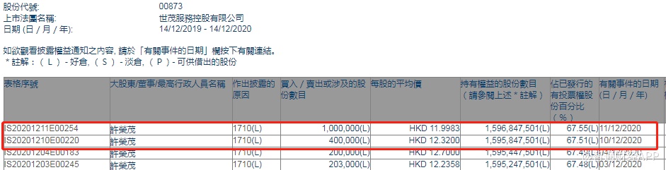 智通财经APP获悉,香港联交所最新资料显示,12月10-11日,大股东许荣茂分别增持世茂服务(00873)40万、100万股,每股作价分别为12.32港元、11.9983港元,总金额为1692.63万港元,增持后最新持股数目约为15.97亿股,最新持股比例为67.55%。
