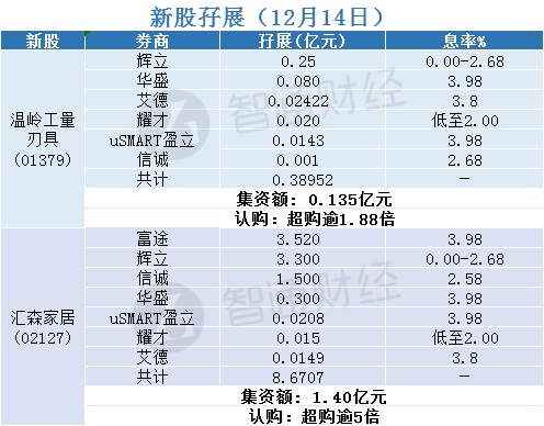 智通财经APP获悉,温岭工量刃具(01379)、汇森家居(02127)正在招股中。截至12月14日,辉立、耀才、信诚等合计分别为其借出近0.38952亿港元及8.6707亿港元。其中温岭工量刃具超购逾1.88倍,汇森家居超购逾5倍。