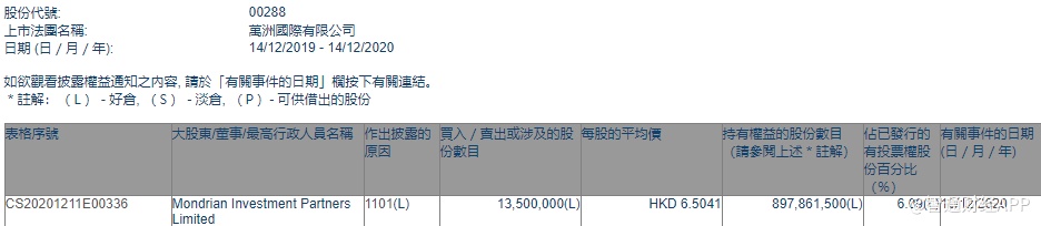 智通财经APP获悉,香港联交所最新资料显示,12月10日,Mondrian Investment Partners Limited增持万洲国际(00288)1350万股,每股作价6.5041港元,总金额约为8780.5万港元。增持后最新持股数目约为8.98亿股,最新持股比例为6.09%。