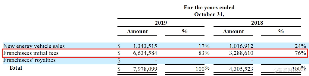 据招股书显示,2019财年时,九紫新能来自加盟商的加盟费占总收入的比例高达83%,新能源汽车销售收入占比则为17%,这说明公司主要的收入来源是收取加盟费用。