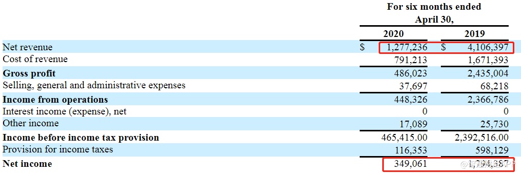 事实上,疫情的爆发对九紫新能造成了明显冲击,在2020财年上半年(截至4月30日止6个月)时,九紫新能的收入为127.72万美元,同比下滑68.9%,净利润亦同比下滑80.55%至34.91万美元。