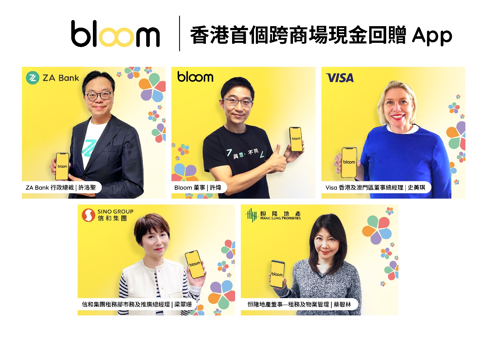 全港首个跨商场现金回赠 App“Bloom”今日正式面世。(上排左起:ZA Bank 行政总裁许洛圣、Bloom 董事许炜、Visa 香港及澳门区董事总经理史美琪;下排左起:信和集团租务部市务及推广总经理梁翠珊、恒隆地产董事—租务及物业管理蔡碧林)