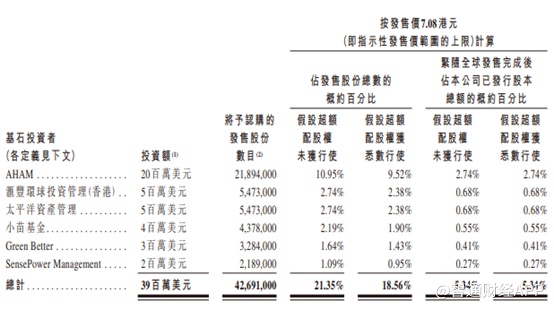公司的多名基石投资者中包括Affin Hwang Asset Management Berhad、太平洋资产管理有限责任公司、汇丰环球资产管理(香港)有限公司、Seedlings Fund、Green Better Limited、Sense Power Management Limited,合共认购3900万美元。