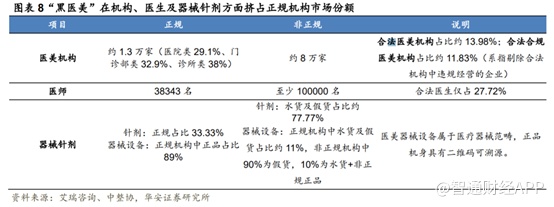 艾瑞咨询数据显示,2019年中国具备医美资质的机构约1.3万家,同时超过8万家生活美业店铺非法开展医美项目;行业医生缺口巨大,合法医生仅占27.72%;器械药品方面,针剂的水货及假货问题严重,器械假货现场普遍,非法医美机构中90%以上医美设备都是假货。