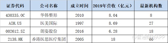 目前国内上市可比公司为华韩整形、医美国际、朗姿股份以及香港医思医疗集团,这四家医美机构分别在A股的新三板、美股市场、A股中小板以及香港市场上市。由于朗姿拥有服装和医美两大板块业务,营收规模高于其他三家可比公司,但从可比的医美业务来看,2019年华韩整形、医美国际、朗姿医疗医美业务以及香港医思医疗集团分别实现营收8.04亿元、8.69亿元、6.28亿元以及18亿元。从营收以及机构数量来看,无疑香港医思医疗集团最大。