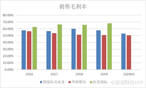 再看毛利率,行业普遍水准在50%-60%之间,从朗姿、华韩来看,一个较为普遍的趋势是毛利率稳中有降,主要原因为市场的激烈竞争带来的毛利率水平的下行,尤其体现在非手术医美领域。