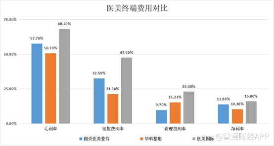 费用方面,整体来看尽管不同机构在成本核算方面有所差异,但是销售费用依然是最高的。华韩整形毛利率三者最低,达到50.7%,不过销售费用率也不高,仅21.3%。而医美国际则属于高毛利率高费用率的类型,毛利率68.2%,销售费用率更是高达47.5%。