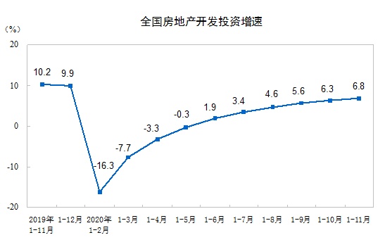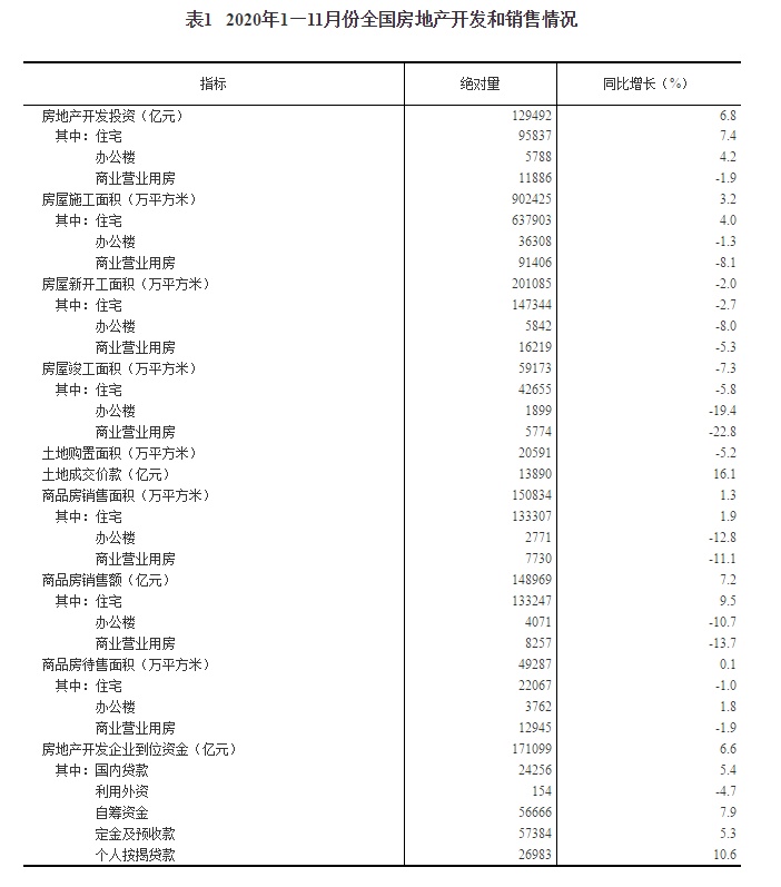 智通财经APP获悉,12月15日,国家统计局公布2020年1-11月份全国房地产开发投资和销售数据。