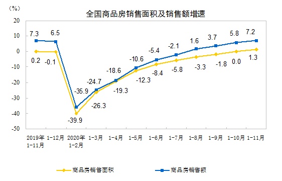 1—11月份,商品房销售面积150834万平方米,同比增长1.3%,增速比1—10月份提高1.3个百分点。其中,住宅销售面积增长1.9%,办公楼销售面积下降12.8%,商业营业用房销售面积下降11.1%。商品房销售额148969亿元,增长7.2%,增速提高1.4个百分点。其中,住宅销售额增长9.5%,办公楼销售额下降10.7%,商业营业用房销售额下降13.7%。