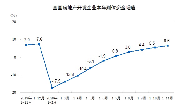 1—11月份,房地产开发企业到位资金171099亿元,同比增长6.6%,增速比1—10月份提高1.1个百分点。其中,国内贷款24256亿元,增长5.4%;利用外资154亿元,下降4.7%;自筹资金56666亿元,增长7.9%;定金及预收款57384亿元,增长5.3%;个人按揭贷款26983亿元,增长10.6%。