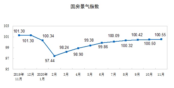11月份,房地产开发景气指数(简称“国房景气指数”)为100.55,比10月份提高0.05点。