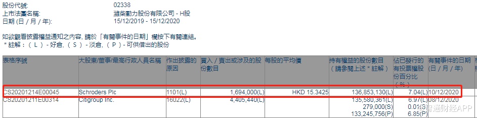 智通财经APP获悉,香港联交所最新资料显示,12月9日,Schroders Plc增持潍柴动力(02338)169.4万股,每股作价15.3425港元,总金额约为2599.02万港元。增持后最新持股数目约为1.37亿股,最新持股比例为7.04%。