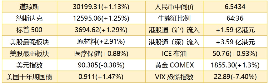 1、 隔夜美股截至收盘,道琼斯指数涨337.76点,涨幅1.13%,报30199.31点;标普500指数涨47.13点,涨幅1.29%,报3694.62点;纳斯达克综合指数涨155.02点,涨幅1.25%,报12595.06点。港股ADR指数跟随上涨,按比例计算,收报26359点,涨151.55点或0.57%。