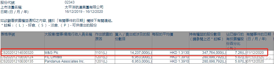 智通财经APP获悉,香港联交所最新资料显示,12月11日,M&G Plc增持太平洋航运(02343)1423.7万股,每股作价1.313港元,总金额约为1869.32万港元。增持后最新持股数目约为3.48亿股,最新持股比例为7.26%。