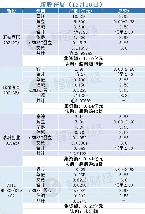 智通财经APP获悉,汇森家居(02127)、瑞丽医美(02135)、清科创业(01945)、CGII HLDGS(01940)正在招股中。截至12月16日,辉立、耀才、信诚等合计分别为其借出近22.98768亿港元、近6.07689亿港元、12.91284港元及0.1703亿港元。其中汇森家居超购逾15倍、瑞丽医美超购逾42倍、清科创业超购逾28倍,CGII HLDGS未足额。