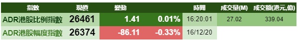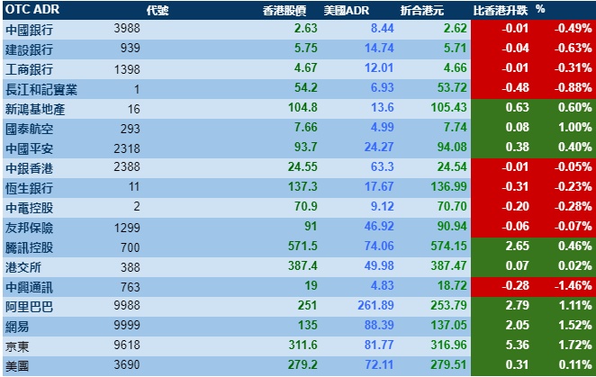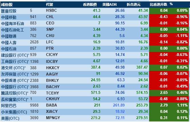 智通财经APP获悉,周三美股三大股指涨跌不一,港股ADR指数小幅上涨,按比例计算,收报26461点,涨1.41点或0.01%。