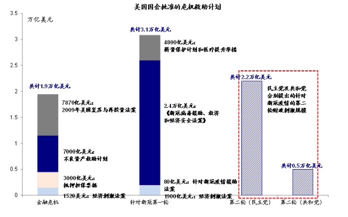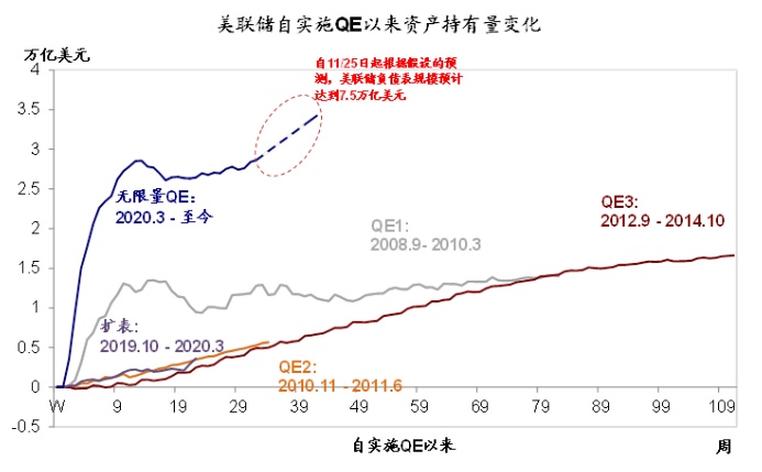 i. 更长时间内维持宽松,但短期加码也似无必要。此次FOMC会议最大的变化就是把QE的指引从此前的时间指引“未来数月(over coming months)”改为目标指引“直到充分就业和通胀目标实现重大进展(substantial further progress has been made)”。这一修改的目的和好处,说白了,就是要锚定在更长时间内维持宽松的市场预期,打消关于可能短期内退出的担忧。这一点,与此前美联储将价格端的加息指引调整为“平均通胀目标制”(即短期以实现充分就业为更重要的目标来决定加息时点)如出一辙。按照这一路径,我们测算2021年底,美联储资产负债表有望增加至7.5万亿美元左右。
