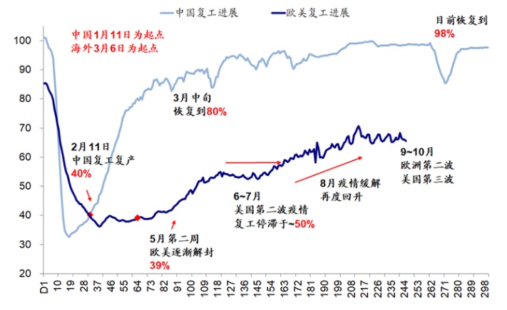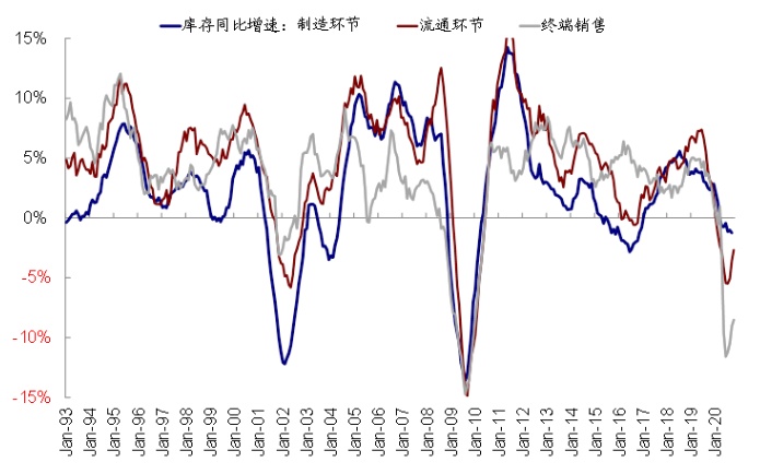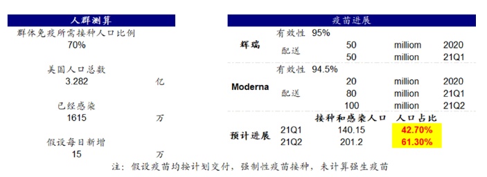 iv. 中期疫苗推动生产修复和补库支撑需求、配合依然宽松的货币条件,整体增长和市场前景依然积极。一方面,假设疫苗整体有效且供应充足的话,我们大体测算明年美国接种比例可以达到60%左右,逼近实现群体免疫的水平。在这一背景下,生产端的复工和产能利用率提升也可以稳步推进(当前复工率约为65%),类似于中国今年2~3季度的情形。另一方面,整体消费和房地产需求端预计仍将维持稳健而不至完全断崖。同时,因供需缺口持续扩大导致在终端消费品和渠道缓解极低的库存水平也会带来补库需求,实际上,补库周期已经开启。因此,生产修复叠加需求相对稳健将使得整体增长修复和市场年前景依然积极,更不用说潜在的新一轮财政刺激和维持宽松的货币条件。当然,潜在风险来自疫苗不及预期、通胀和利率抬升过快、以及政策和地缘不确定性风险。