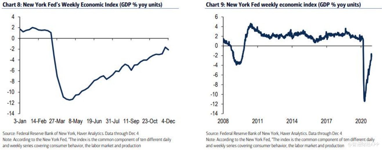 除了美国银行的信用卡数据之外,其他机构的数据也显示了持续强劲的消费趋势。截至12月4日当周,纽约联邦储备银行周经济指数同比下跌0.5个百分点,至-2.1%,延续了上周卫生事件危机后创下的同比下降1.6%的新高,与此同时,4周平均值的跌幅由前4周的3.42%降至2.41%。根据这一综合指标,经济继续复苏: