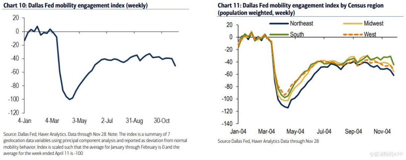 截至11月28日感恩节当周,达拉斯联邦储备银行的流动性和参与度指数(mobility and engagement index)大幅下滑至-50.6,前一周为-39.6。这是截至5月30日当周以来的最低水平,可能是因为感恩节假期,人们有更多时间待在家里。在地区层面上,所有四个人口普查地区的流动性在那一周都有所下降。