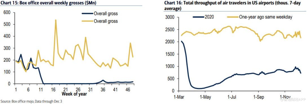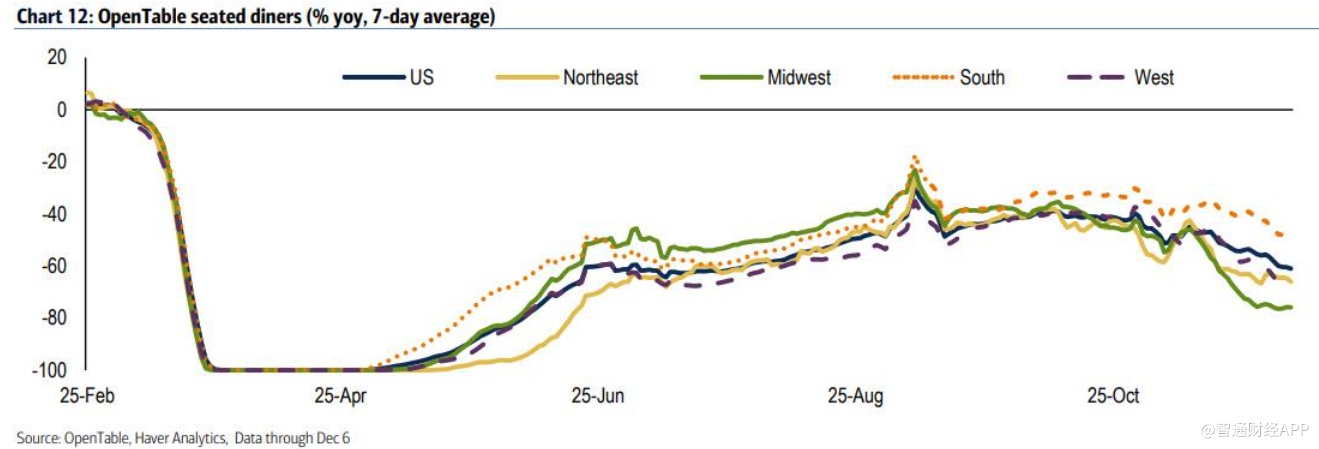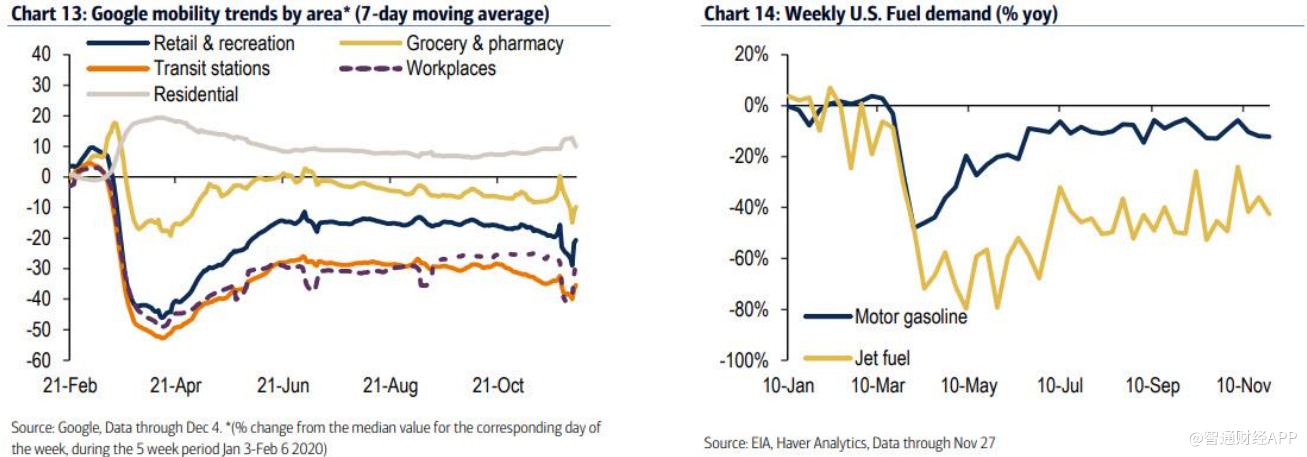 谷歌流动性指标显示,消费者继续减少家庭以外的活动,延续了感恩节前的趋势。在截至12月4日的七天期间,前往零售和娱乐场所、工作场所和交通车站的游客均较两周前减少。