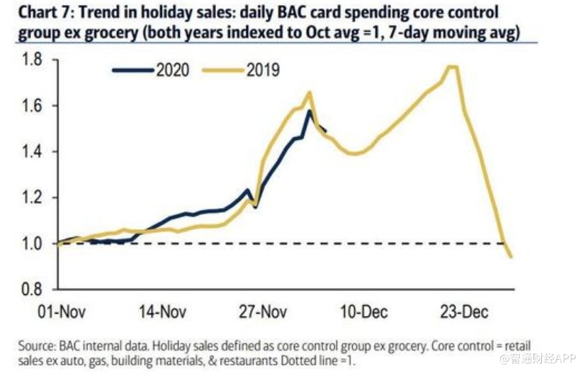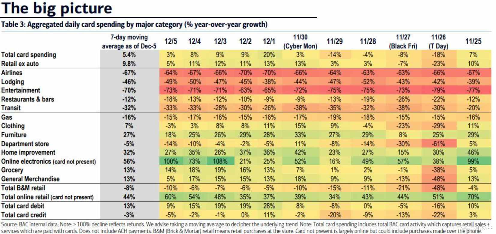 美国银行是美国最大的信用卡发行商之一,该行公布的最新信用卡和借记卡综合数据显示,与悲观预期相反,消费者需求恢复正常,截至12月5日的7天内,信用卡总支出同比增长5.4%,此前两周出现大幅波动。重要的是,美国银行的假日销售指标与去年趋势保持一致,累计同比增幅高达19%,反映出假日期间对商品的需求非常强劲。