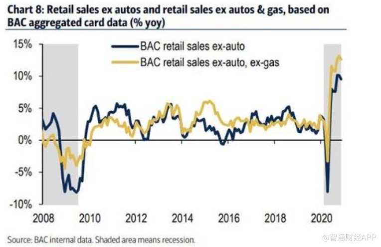 美国银行解释道,根据信用卡数据,扣除汽车和季节因素后的11月零售销售与10月持平,非实体零售(在线)支出月度环比下降,因为10月Prime
