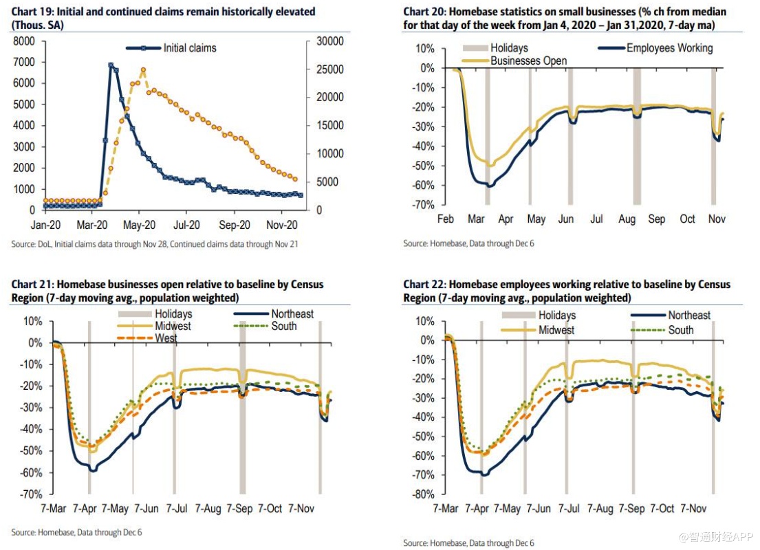 小企业就业继续显示出萎缩的迹象。Homebase的就业和小型企业开业数据恢复了感恩节前的下滑趋势。这些数据继续表明,对活动和社交隔离的更严格限制正导致小企业裁员。