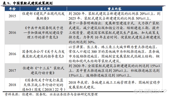 2016至2017年,国务院和住建部相继颁布《关于进一步加强城市规划建设管理工作若干意见》及《“十三五”装配式建筑行动方案》,对全国装配式建筑占新建建筑的比例提出要求:到2020年达到15%以上,至2025年达到30%,即在未来的五年内,装配式建筑需求存在翻倍的空间。