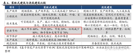 此外,装配式建筑能有效降低施工现场污染,在环评处罚力度大、绿色建筑政策的力推下,装配式建筑也成为最大的赢家。国家在《建设项目环境保护管理条例》中对环评不合格的建筑有相应规定,环境保护设施验收不合格的建筑,将由县级以上环境保护行政主管部门责令限期改正,并处20万元以上100万元以下的罚款。2017年,住建部印发《建筑节能与绿色建筑发展“十三五”规划》,要求到2020年,城镇新建建筑绿色建筑面积比重超过50%,绿色建材应用比重超过40%,能效水平比2015年提升20%;城镇既有居住建筑中节能建筑所占比例超过60%。